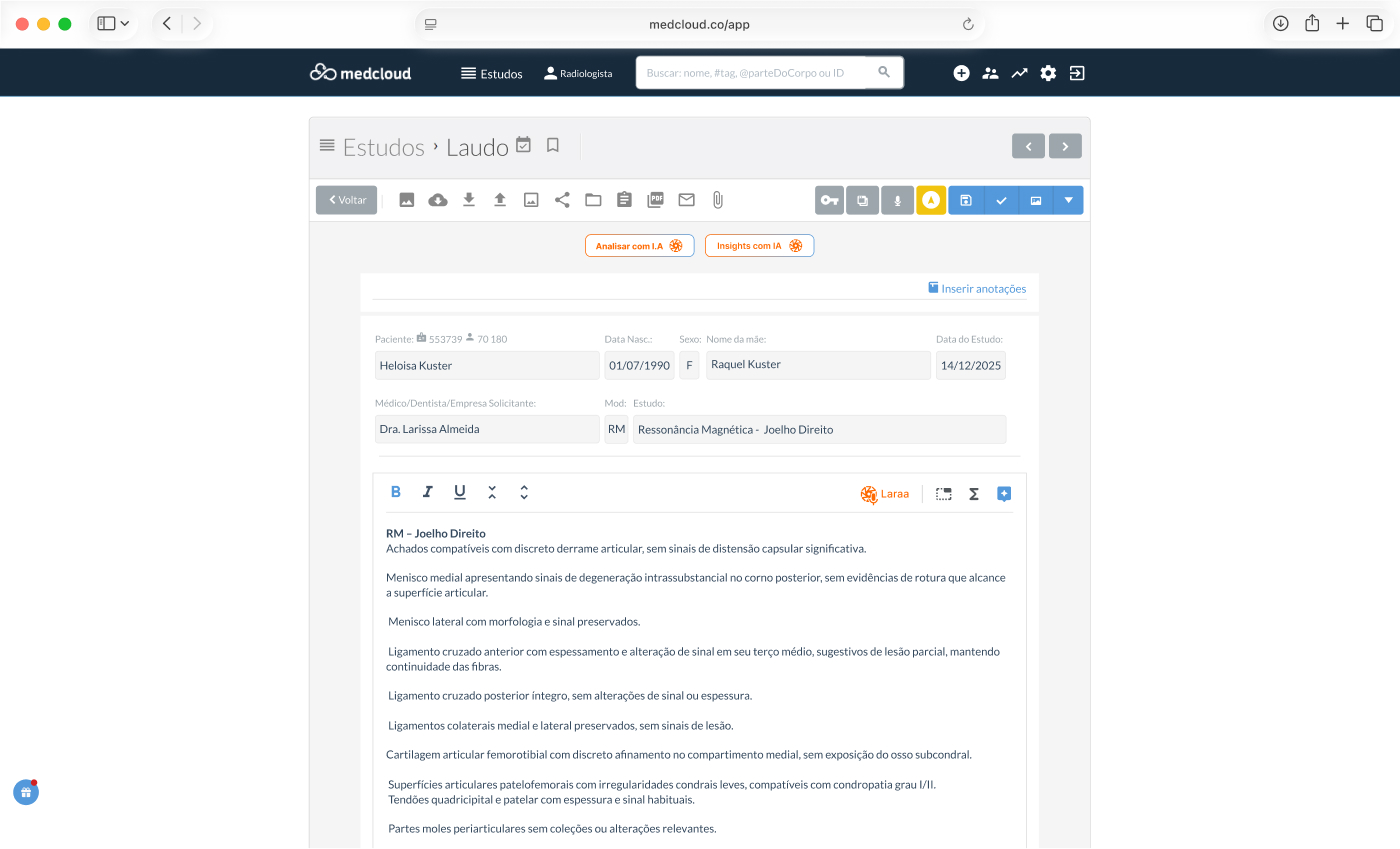 Crie laudos via reconhecimento de voz, ditado digital e modelos de laudo padrão em apenas alguns cliques. Adicione imagens chave e vídeos para laudos multimídia.